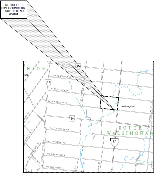 The Big Creek 6th Concession Bridge, located on 6th Concession Road approximately 0.40km west of Highway 59 near the village of Walsingham, which spans Big Creek requires a major rehabilitation to the bridge structure.
