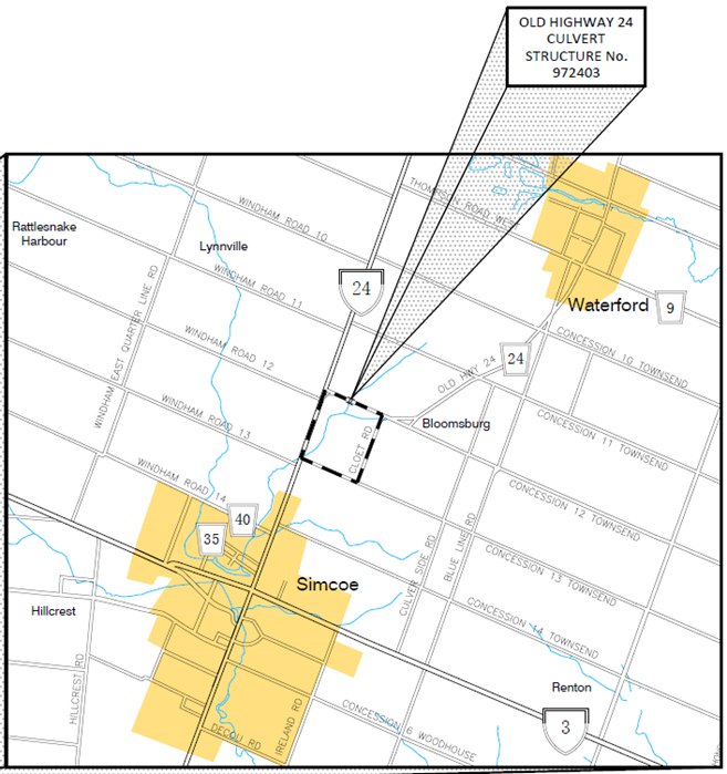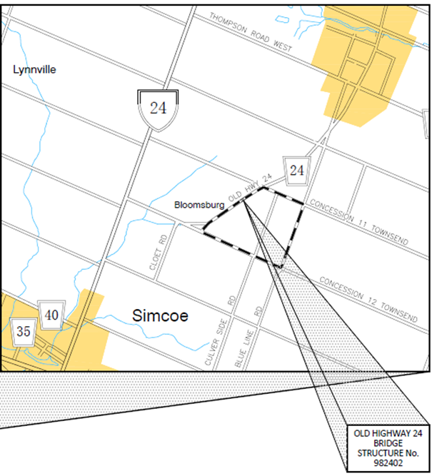 Bloomsburg Bridge, located on Old Highway 24, approximately 600m north of Concession 12 Townsend, in the village of Bloomsburg and Old Highway 24 Culvert, located on Old Highway 24, approximately 550m east of Highway 24 require replacement.